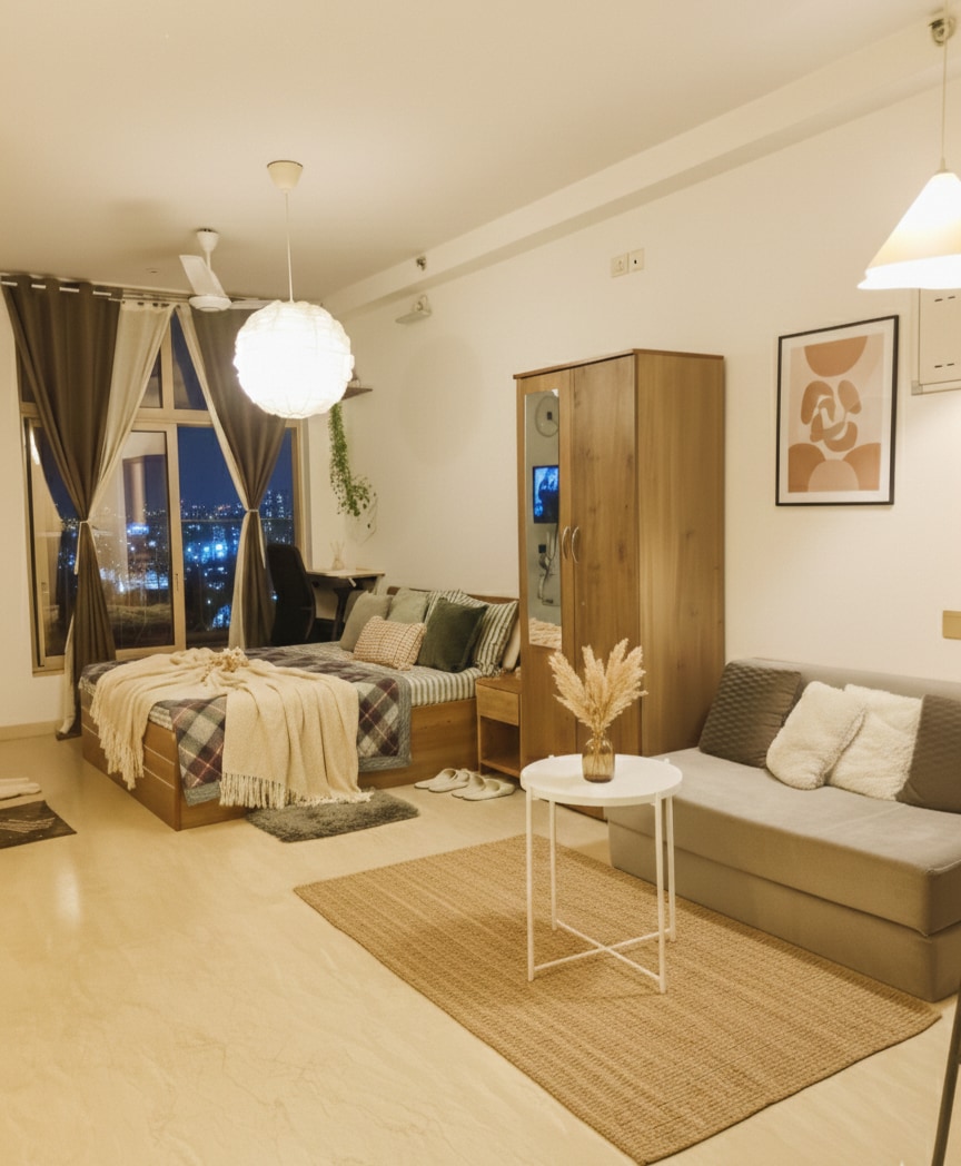 Welcome to PeakView Studio by OasesHomes – a cozy, budget-friendly stay in Hiranandani Estate, Thane. Enjoy a comfortable bed, Smart TV, Wi-Fi, a fully equipped kitchen, washing machine, and daily housekeeping. The apartment includes branded toiletries, fresh linens, and 24/7 gated security. Located close to cafés, clinics, and “The Walk,” it's perfect for short trips, business stays, or peaceful retreats.