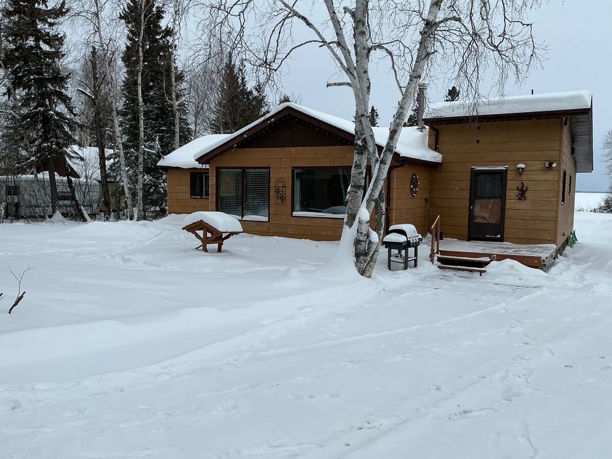 Take a break and unwind at this peaceful oasis. Lakefront cabin with direct access to fishing out your front door, or taking the kids for a swim in our breathtaking lake. Walking trails and skidoo trails right out your back door and only 15 minutes to town.