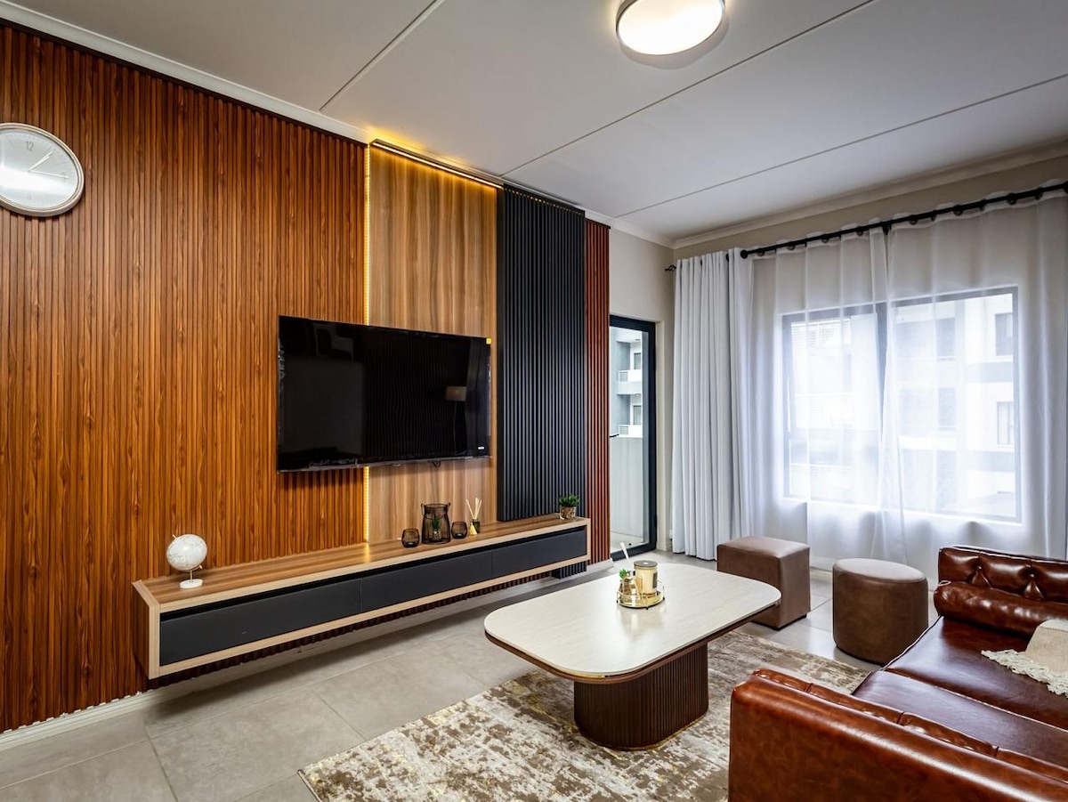 Safe, Stylish & Spacious Near Sandton. Unwind in this beautifully styled, extra-large studio apartment set in the secure Thornhill Estate conveniently close to Sandton and OR Tambo Airport. With a generous open-plan layout with a full kitchen, luxury finishes a spa-like bathroom with dual basins, a walk-in shower and an oversized bathtub. Dedicated workspace and fast Wi-Fi. Access to estate amenities including a shared pool. Perfect for work trips, solo travellers or couples.