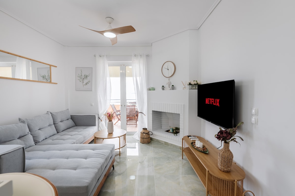 The apartment is on the 2nd floor of a detached house which includes a living room with fire place and mini bar,a kitchen full equipped,a bathroom and a big bedroom with a jacuzzi inside.Ideal for couples!!!!!! There is also a big balcony with a fantastic view of Corfu town and the suburbs. The distance from Corfu town is about 2 km ,from the port 3 km and 2 km from the airport. The bus station is 5 minutes walking . Car and bicycle rental in good prices ,without extra charges. Netflix on Tv