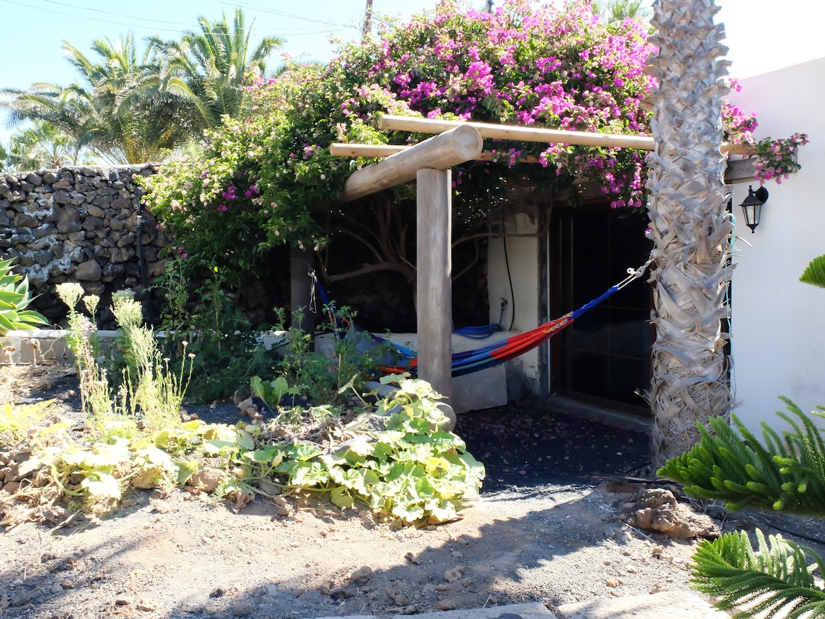 Weekly ▪ discount 5% 10% monthly▪ discount Ideal for teleworking (quiet and peaceful) and very good Wi-Fi connection. Casa El Jardín de Tias is a small house next to our house, with a separate entrance. It has two rooms and a bathroom. There is also a covered terrace where you can eat overlooking the garden, and another hammock and relaxation area in the shade of a bougainvillea.