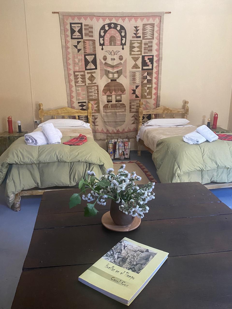 It is a large cabin for five people has a double bed and three beds of one and a half square with a bathroom with hot shower by solar thermal tank a small kitchen a fridge pothole and a small pool to wash clothes if you want in the largest bedroom there are the beds of one square and in a smaller bedroom the double bed where there is also a large window where you can see the landscape of the pucara has a grill and a table