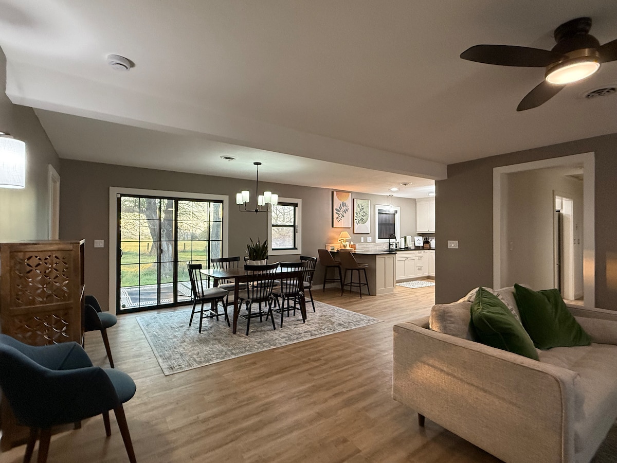 Set on 23 peaceful acres just 5 minutes from Lawrence, KS, this private basement retreat offers the perfect blend of country charm and convenience. Enjoy wooded walking trails, open meadow views, and time with our animals. Sip morning coffee on the east patio at sunrise or unwind beside the fairy garden at sunset. End your day with a fire on your private lower deck under wide-open Kansas skies filled with stars. All while being 5 minutes from town & Rock Chalk park!