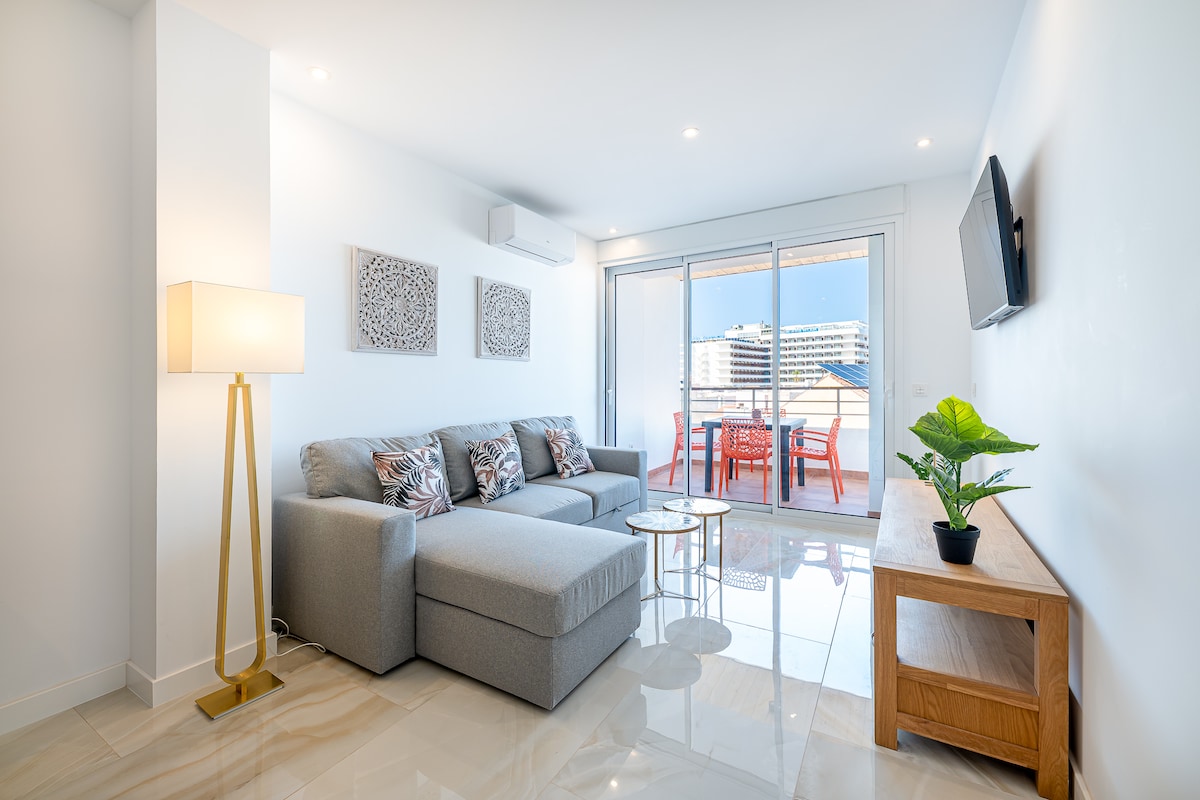 Andalusian style 2 bedroom apartment with 2 balconies in Pueblo Blanco. It is located very close to the stairs towards the beach and right in the middle of the entertainment area, bars and restaurants. Each bedroom is equipped with a queen-size bed. One bedroom and one balcony overlook the Pueblo Blanco square and the other bedroom and balcony overlook partly the sea. The spacious living room has a smart tv, dining area and fast internet. Furthermore there is a fully equipped separate kitchen.