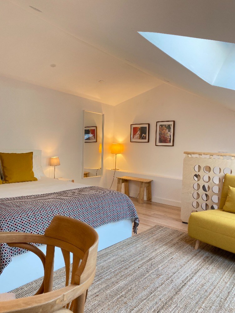 The Garden House is a cosy and secluded studio apartment for two people that overlooks our lush garden and is the ideal choice for a peaceful and relaxing getaway. Appointed to a high standard with natural materials, such as oak parquet ceiling and floors and linen curtains, and decorated in soothing natural colours, it blends harmoniously with its surroundings. Large patio doors lead out onto a spacious and private terrace with a dining table and chairs and a wooden sofa.