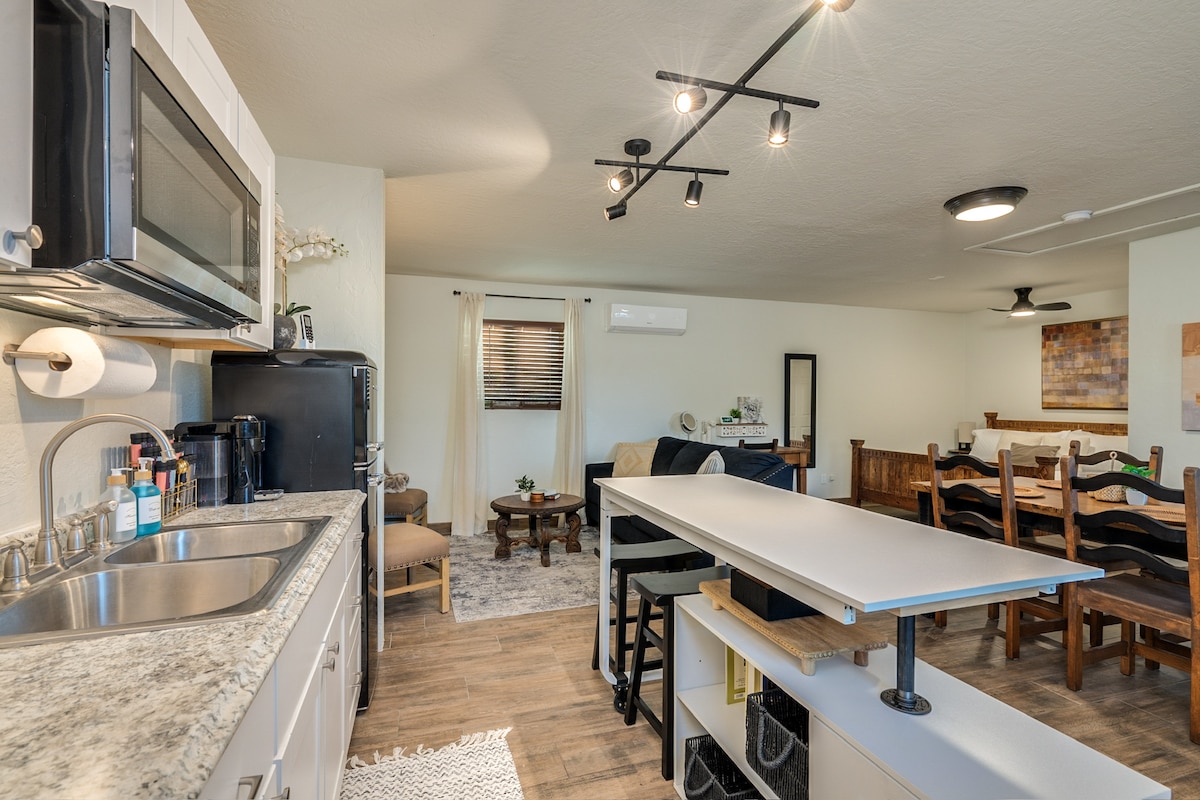 Welcome to this private and tranquil guesthouse in Tucson! This peaceful retreat has a private bathroom, a comfortable queen bed, and high-speed WiFi. A large TV awaits, perfect for streaming your favorite shows and movies. The refrigerator and microwave allow for you to store and prep snacks or light meals. With ample storage space, you can unpack and settle in comfortably. The spacious, private patio provides a secluded space to relax and rejuvenate. Relax in private cactus garden.