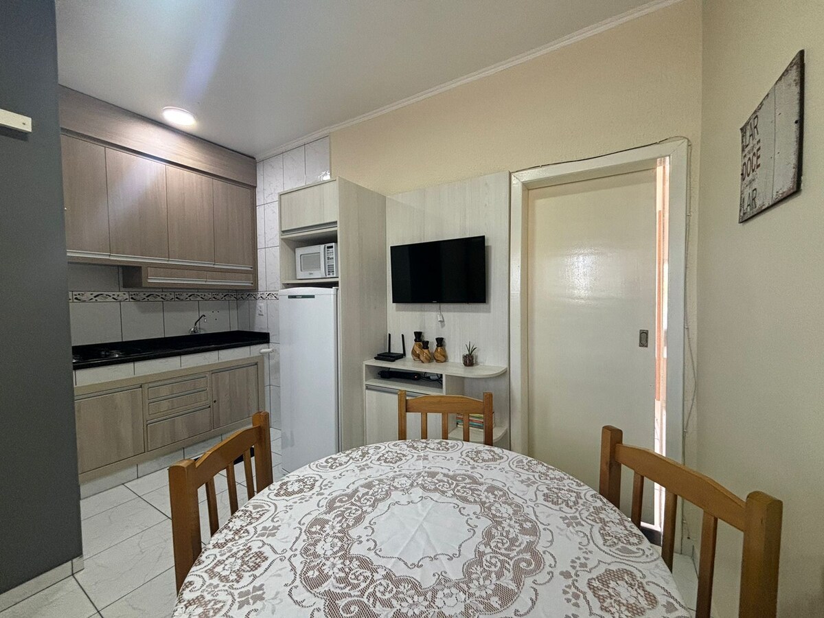 ✅️Entire space - apartment in the center/beachfront, close to the EU AMO TRAMANDAÍ sign and the BISTEK Supermarket. ✅️It consists of 1 double bedroom, living room, kitchen, single corner/1 raised bed, 1-seat sofa bed, bathroom (small), ground floor. It has a coffee maker, blender, microwave, toaster, washing machine, dishes, cutlery, pots. ✅️Condominium with: ballroom, barbecue grills, playground, court, bocce ball court, showers, parking for up to 2 vehicles, 24-hour concierge.