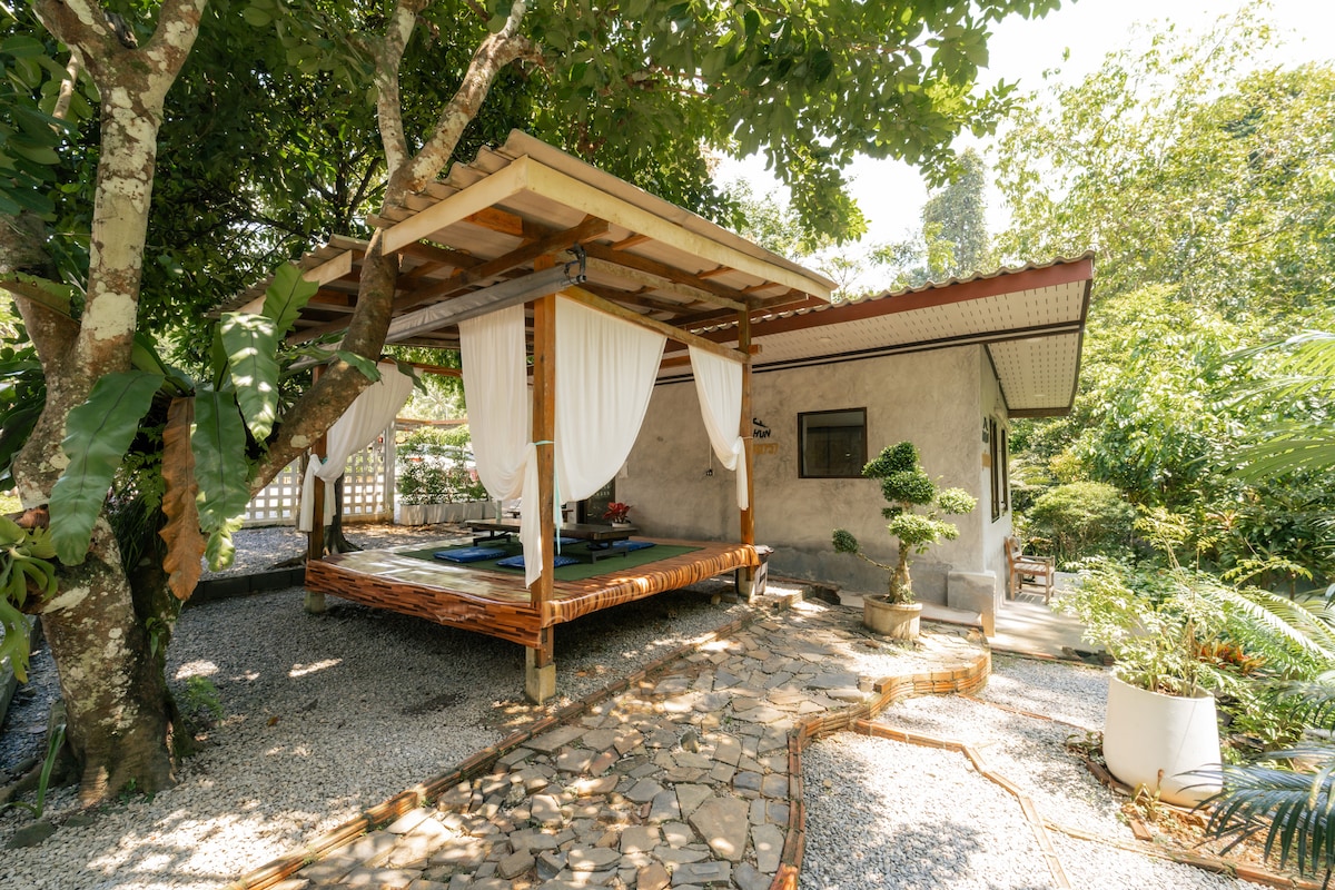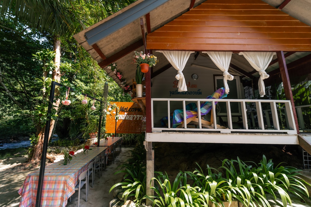 Quiet and peaceful private AC room with king-size bed, private bathroom, and tranquil garden view. Included breakfast. private bathroom with hot water shower, a porch with a fan a garden and jungle view, outdoor seating, TV, kettle for tea/coffee, mini bar for a fee. Featuring the only fully stocked bar in central Koh Lanta and a lunch/dinner cafe. Our location is <1 KM from Lanta Elephant Sanctuary and the Mai Kaew Adventure Cave, 2 km to Klong Nin Beach.