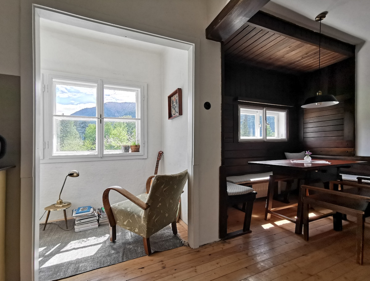 Die Unterkunft ist im ersten Stock eines Altbestandes Baujahr 1930. Die im Jahr 2016 generalsanierte Wohnung verfügt über einen eigenen Eingang. Auf der Veranda lässt sich mit Blick auf die Berge und Morgensonne das Frühstück genießen. Der rückwärtige Garten lädt zum Entspannen am Nachmittag ein.