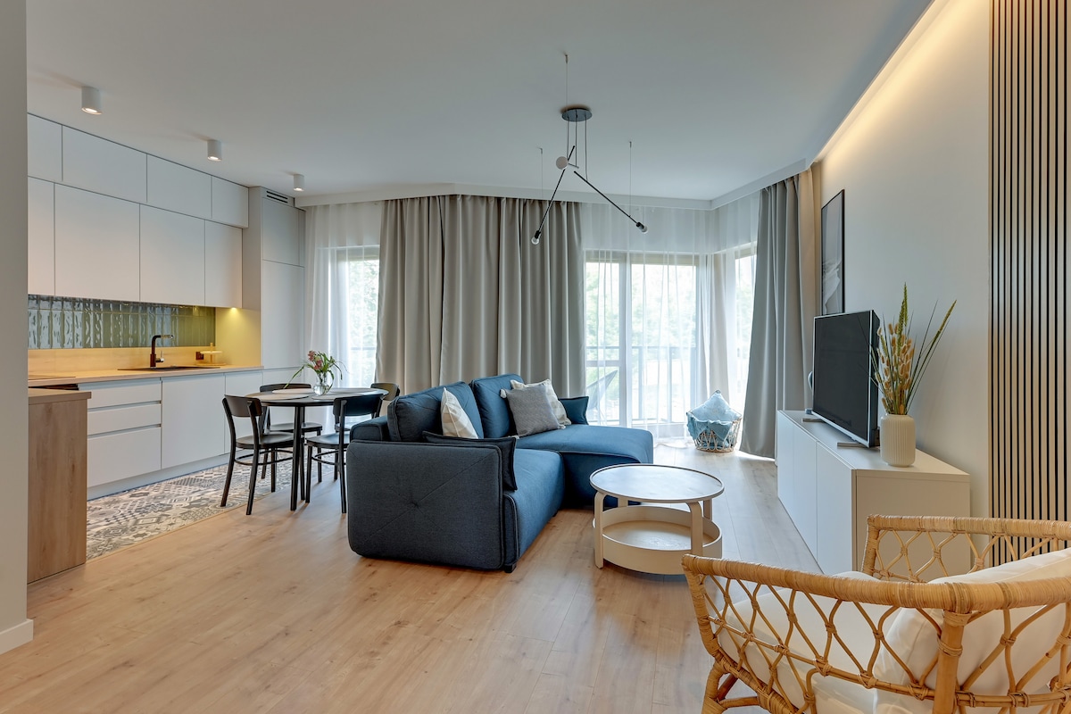 A freestanding bathtub, balcony, and stylish interiors — perfect for couples or families with children! This apartment features a bedroom and a sofa bed in the living room, comfortably sleeping up to 4 guests. On-site amenities include a gym, sauna, rooftop terrace, and playground. Located near Gdańsk’s Old Town and the Motława River — ideal for a romantic getaway or a family stay.