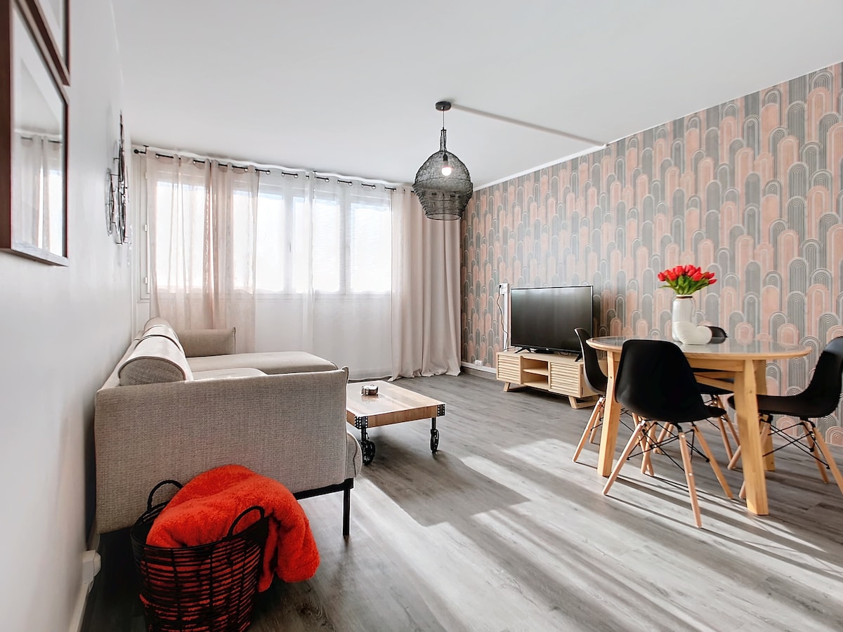 Cozy, fully renovated, very bright apartment, unobstructed and quiet view of 42 m2 located 100 m from the train station. Bedroom with double bed, bathroom with bathtub and toilet, living room and equipped kitchen. The apartment is fully equipped and has fiber optic Wi-Fi. Linens and towels are available during your stay. Downtown is within walking distance in 10 minutes. Easy parking close to the apartment (for a fee). Small Franprix next door for groceries.