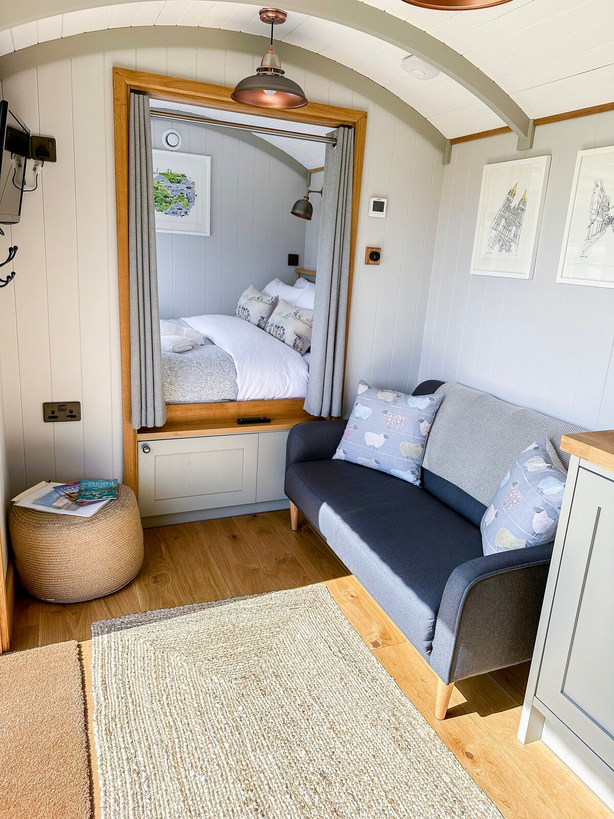 Escape to a cosy, secluded retreat in Cornwall this winter. Our hand-built Shepherd's Hut, Longwool, offers a luxurious, private stay in a newly planted apple orchard on a working farm. Enjoy the king-size bed, en-suite shower room, fully equipped kitchen, and underfloor heating. Warm up by the log burner with logs provided, and take in stunning countryside views from your outdoor seating area. Perfect for a winter escape with similar comforts of a hotel room.