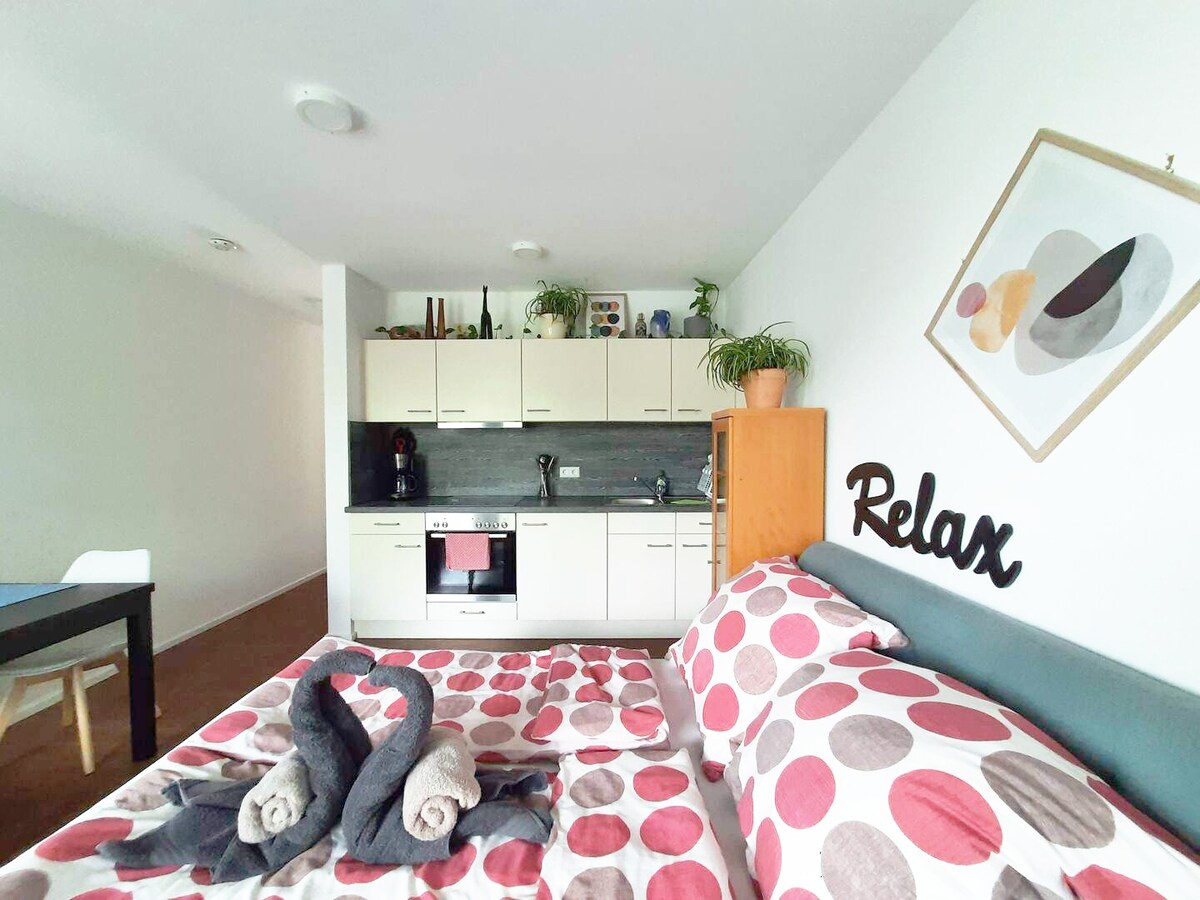 A spacious, modern 61sqm apartment, perfectly located in Lustnau-Tübingen. A bus stop is located directly in front of the building and there's a reserved parking spot in the underground garage. There's one bedroom with a king sized bed (180x200) and a sofa-bed (140x200) in the living room with a movable wall for added privacy. A covered terrace with a lawn in the back makes for a perfect, quiet getaway.