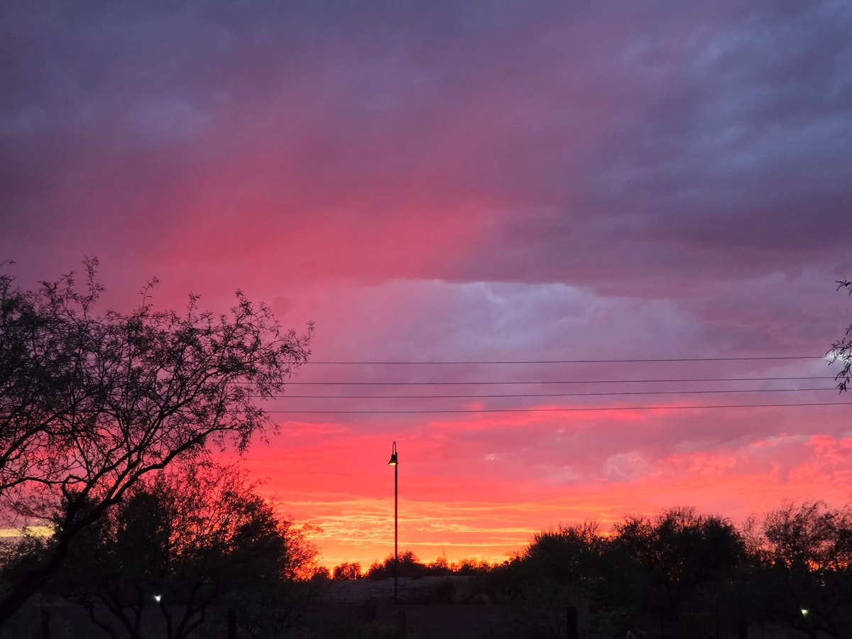 2017 guest house in Tucson Mountain foothills adjacent to Sweetwater Preserve (14+ mi.s of trails: mountain biking, horseback, running, & hiking)! Enjoy the giant soaking tub, BBQ grill, sunsets & patio. A full kitchen, sitting area, bath & BR are downstairs (550 sq. ft.). Up a 90-degree ladder to BR/retreat space, wonderful for getaway views. Our property is a 3-acre lot w/ desert flora/fauna, stars, & quietness, yet only 10 mi. from UA. Horses add to the ambiance with a taste of ranch life.