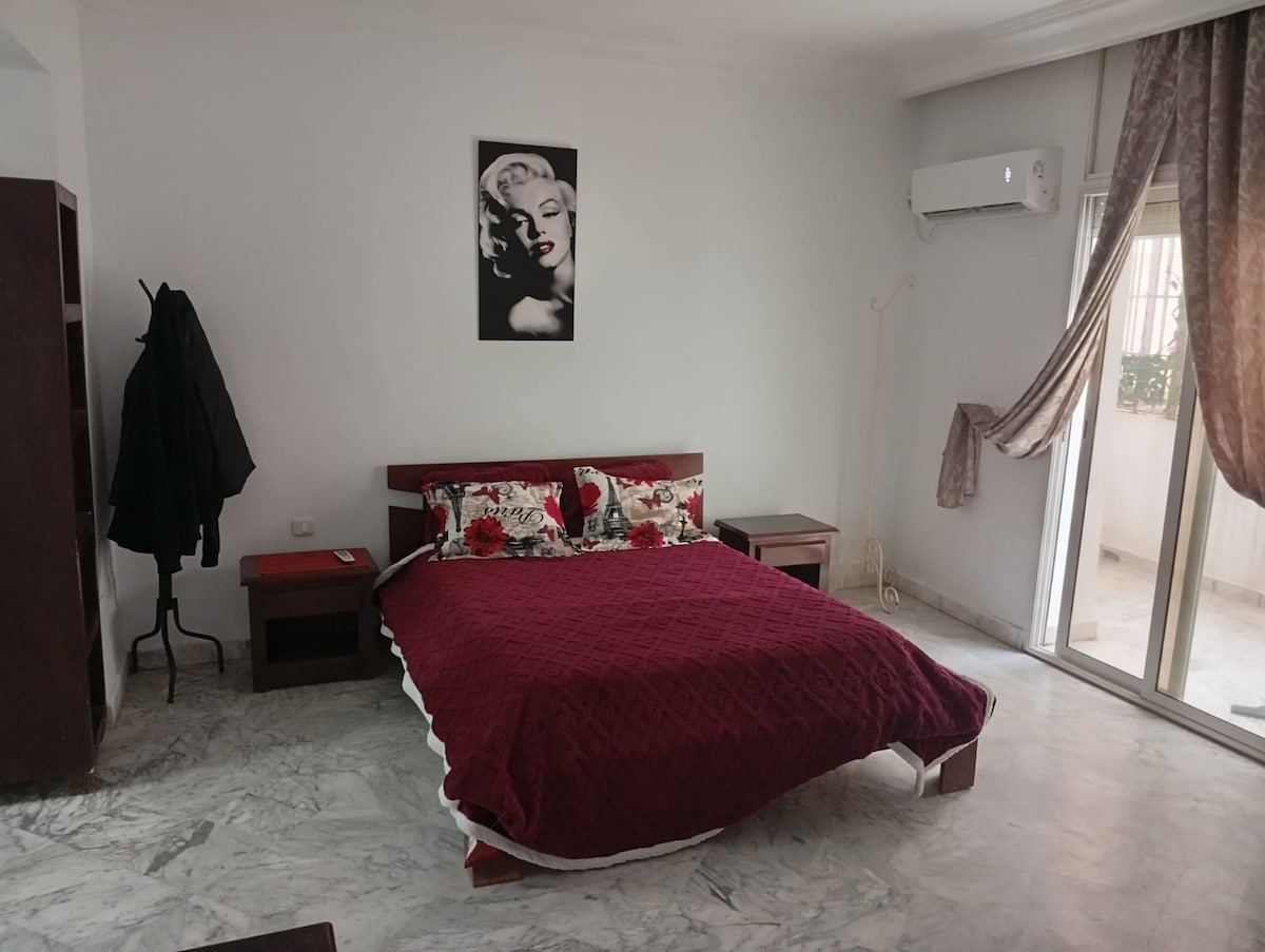 Studio- very calm with garden view in the heart of the city, close to the sandy beach, city center, old town (Medina). no need for car, everything reachable by feet. It comfortably fits couples or couples with one child or baby. With shower, air-conditioner,heater, free WIFI, satellite TV, kitchenette.balcony,towels,linen, utensils... nextdoor: bakery, supermarket, restaurant, coffee shop, fruits shop, pharmacy,polyclinic l excellence