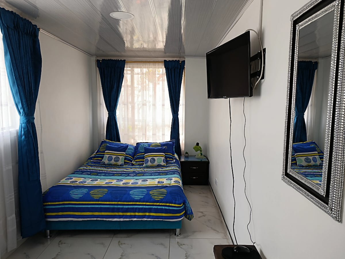 Apartaestudio tipo loft independiente muy tranquilo, en el podrás disfrutar de un Smart tv 43' con tv cable para ver tus mejores programas, películas o eventos deportivos. La comodidad de una cama doble con sábanas, almohadas, cobijas. Cocina completamente equipada para que prepares tus platos y bebidas favoritas. Baño con agua caliente y para tus horas de trabajo cuentas con escritorio y una silla cómoda, todo esto para una linda experiencia como en casa.