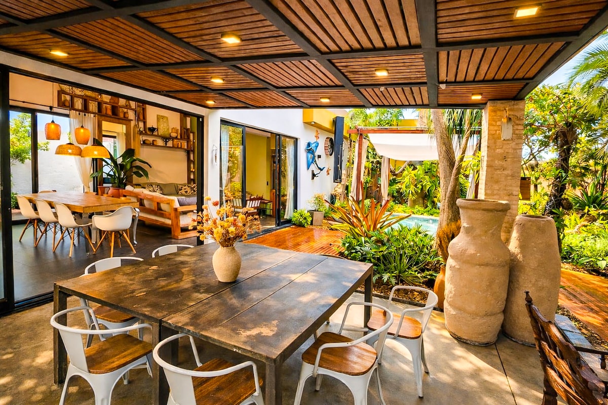 A beach retreat within Uberlândia! A unique place in the city, with an incredible experience of being in contact with nature within the city. Super spacious place with rustic decor. The bathroom of the suite connects you as if you were in a waterfall, the backyard is a reinterpretation of a beach on the coast of São Paulo. Come and live this experience!