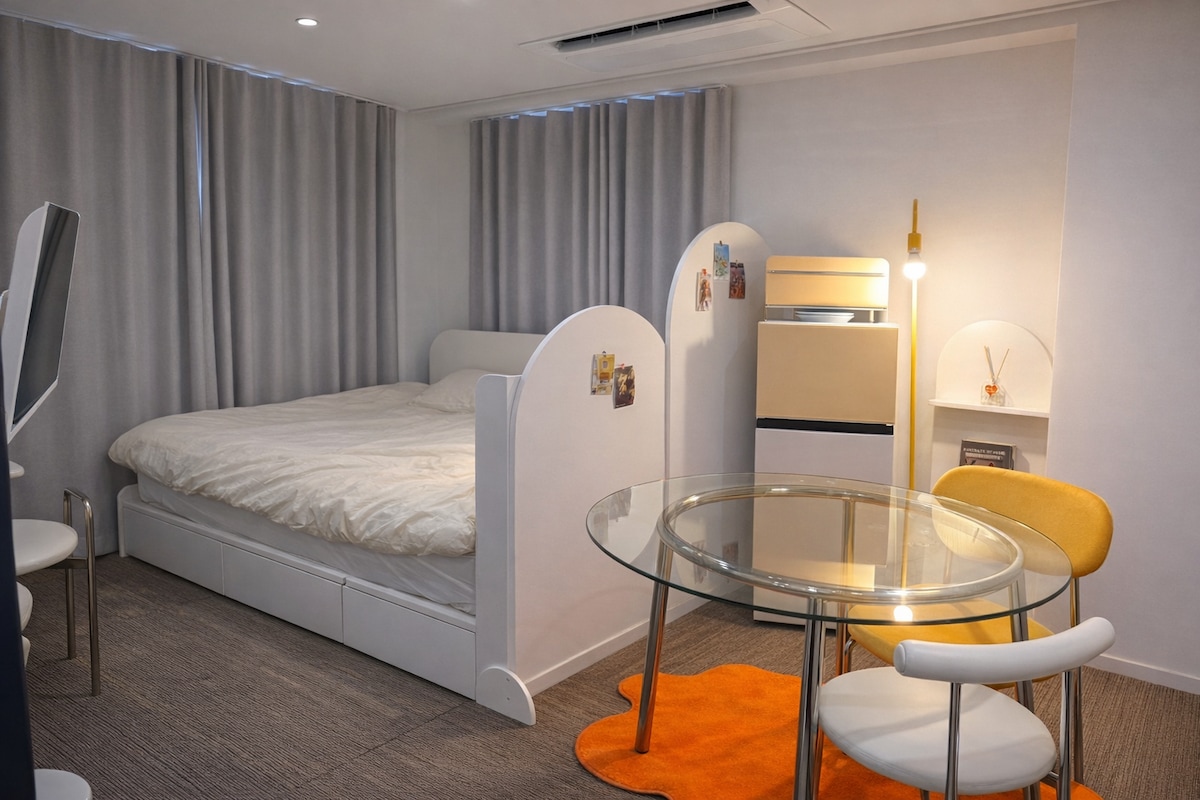 This quiet and cozy accommodation is located 7 minutes on foot from Hwangnidan-gil, Daereungwon, and 2 minutes from the Express Highway Tunnel. It is located in a very convenient place for transportation, so it will be a comfortable trip to any cultural heritage site in Gyeongju. There is one living room (kitchen), one room, and one bathroom, and the laundry room is equipped with a washing machine and a laundry rack. Cooking tools are available. I think it is a suitable accommodation for everyone, including families, couples, and businessmen. If you visit for business, you may stay for a long time.