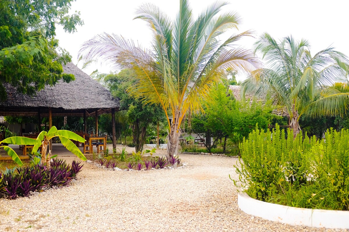 Wake up on the waterfront of the Indian ocean and a hot cup of coffee. Ocean to mouth eating fresh calamari-fish-crab, kayak to an island, watch sunsets, moon rises, bonfire evenings at waterfront restaurant/lounge. Lazy hammock days, rustic luxurious peaceful living, 6 star meals, not far from Kendwa/Nungwi. We live a simple life! This is not a luxury hotel, but a place to unwind and enjoy good company and nature. Welcome all travelers, families and couples. Breakfast is included.