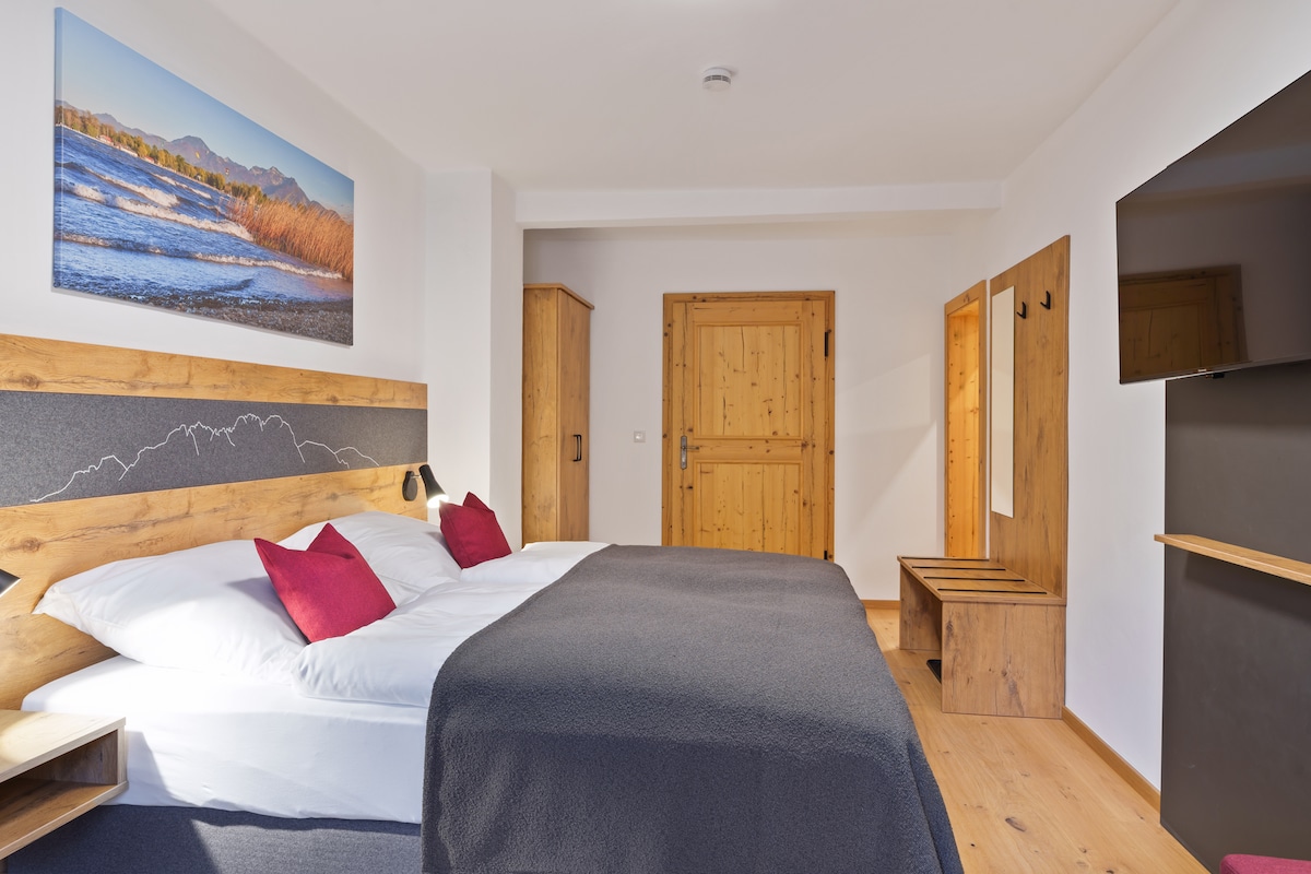 This bright and airy single room extends over 15 square metres and fits one person. The Bavarian-style space includes a comfortable single bed, a modern bathroom with shower, a spacious wardrobe and a window that looks out onto a relaxing nature view. For guests who want to plan out their nature retreat in Unterwössen or do some reading while taking in the mountain views, the room also comes with a desk, a TV and a comfy chair.