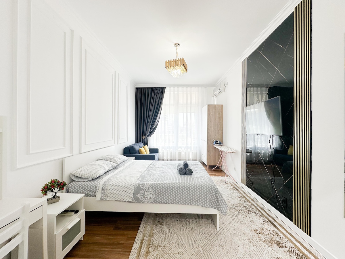Стильная двухкомнатная квартира с характером в самом центре, рядом с исторической частью города, в 5-10 минутах хотьбы многочисленные заведения, музеи, рестораны (Barrel, Eldivino, Befor, Coffee Original), офисы *** -Просторная квартира с кухня-гостиная и отдельная спальня -Стиль, уют и чистота -Тропический душ -Ортопедический матрас -Плотные шторы blackout -Имеется кровать и большой раскладывающийся диван -Фильтр для воды -Безключевой доступ -Новый ремонт