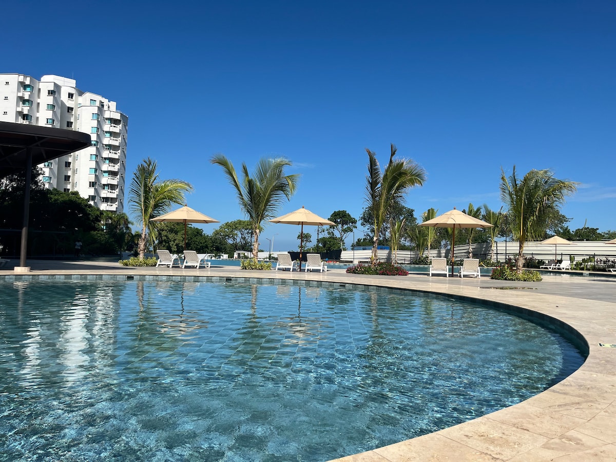 Despierta con la brisa caribeña en este hermoso y moderno apartamento, a solo 5 minutos del Aeropuerto Simón Bolívar. Disfruta de sus piscinas, jacuzzis, acceso privado y directo a la playa, y seguridad 24/7. Todo frente al Mar Caribe. Perfecto para 4 huéspedes, está ubicado cerca del Hotel Decameron Galeón y Casa Kapikua, donde encontrarás el balance perfecto entre confort, naturaleza y una escapada junto al mar. Lugares de interés: ●Rodadero a 20 minutos ●Centro histórico 30 minutos