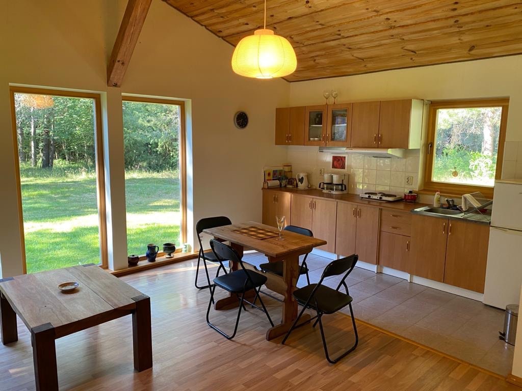 The house is located in a quiet place, in a forest, in a fenced area without neighbors (there is only one holiday house in the area). Perfect for relaxing from the city noise. The house has everything you need for overnight stay. A barbecue and a campfire area are available on the premises. There's a lake a couple of hundred meters away. Boat rental and hot tub available for a separate fee.