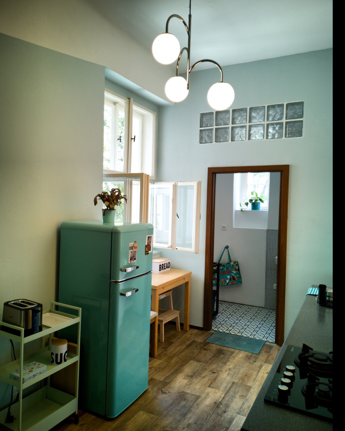 The apartment is not large, only 60m2. Food and drinks for the first breakfast, fresh fruit, coffee, tea are available throughout the stay. The equipped kitchen is fully available. The MINIMUM number of nights to rent is 5. Quiet street overlooking the garden. To the center about 10 min 2 tram stops to the metro station B, C. B: Palmovka, C: Holesovice Station. There are 3 pubs on the street, they cook homemade food at a price of about 140-190 CZK, 5 min walk is the DM shopping center, Albert and Billa.