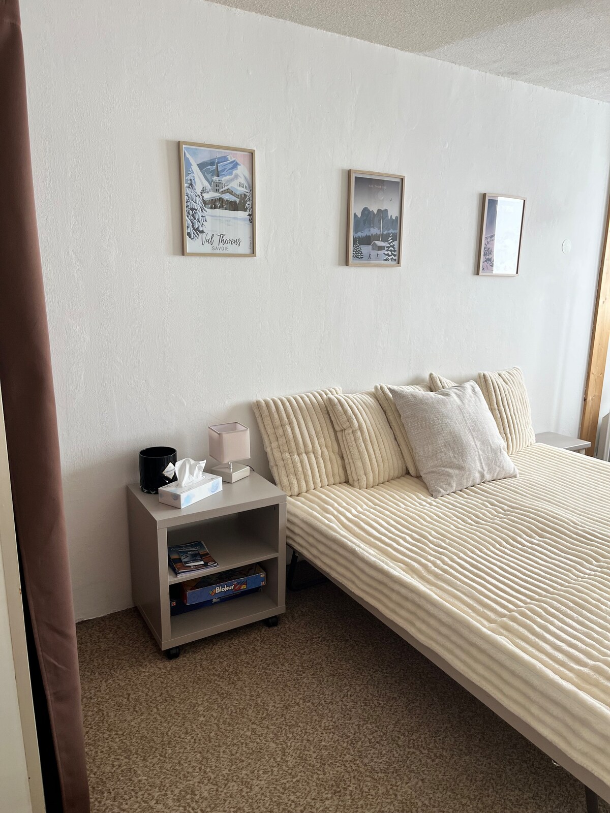 Renovated in summer 2024. 1 Bedroom- 1 Double Bed + 1 Single Bed Living room: 1 double sofa-bed or 5 seats in total. 30m apartment, south-west orientation in a small 3-story residence with a terrace overlooking the ski and children's toboggan runs. Located in the heart of the 3 Valleys, in Val Thorens, in the center of the resort, on the plateau of Place Caron in a cul-de-sac. Cleaning and linens included in high ski season but not included in low season outside skiing