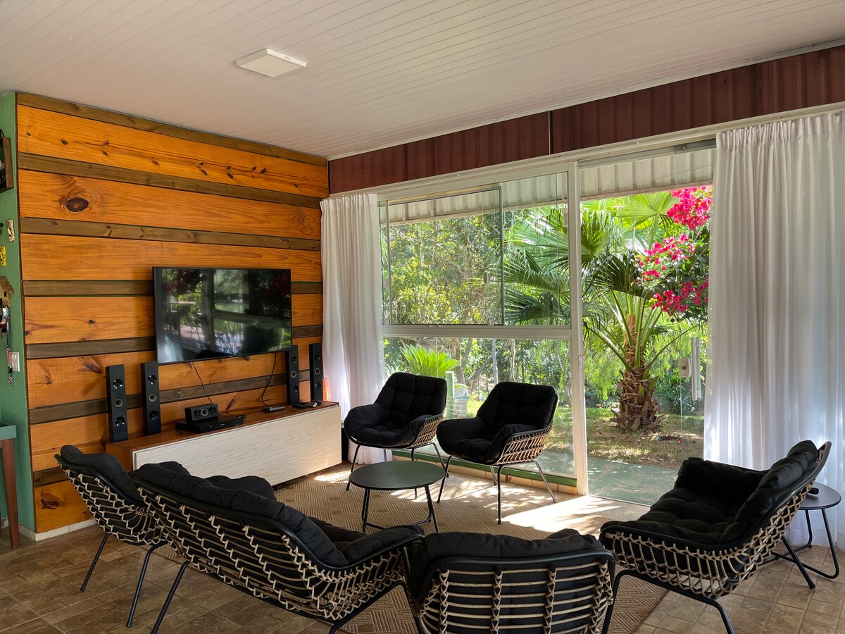 Relaxe neste espaço calmo e cheio de estilo. Terreno totalmente cercado, ideal para deixar seus pets livres. Sempre bom lembrar que vc estará num ambiente semi rural onde as comodidades da cidade podem sofrer alterações como falta de energia/internet, não é comum mas podem oscilar. Há muitos pássaros,saguis,frutas,horta natural. Muita área livre e piscina estruturada, 7mil lts. Espaços para conversar, redes e churrasco, fogueira . A casa é simples e cheia de charme informal.