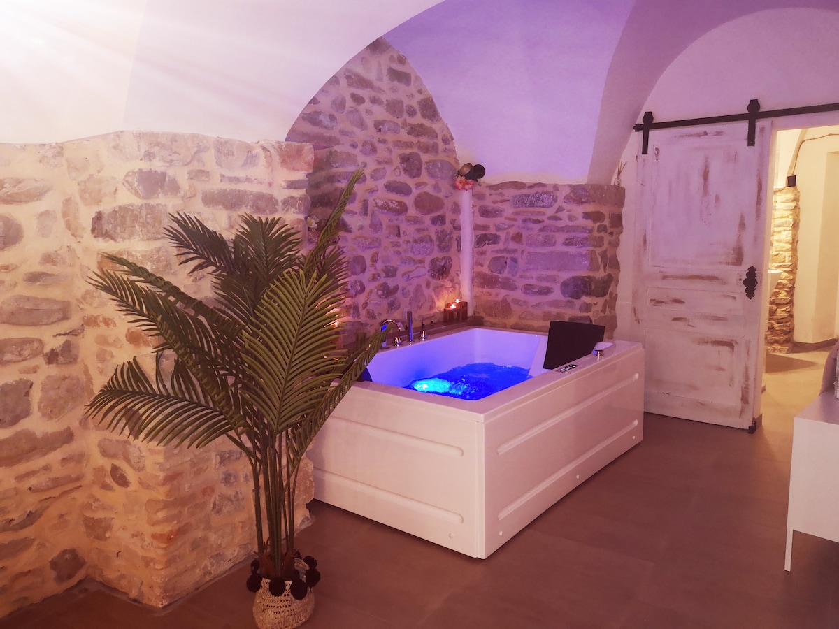 The house in Ginevra is not the classic spa. Originally, it was a place used first as an oil mill and then as a carpentry shop. The village elders tell of how they gathered here to take refuge during World War II. The love for these places has led us to transform this unique space into a loft equipped with all modern comforts, with an exclusive wellness area, without altering the original character of the stone walls, vaults, and the ancient door.