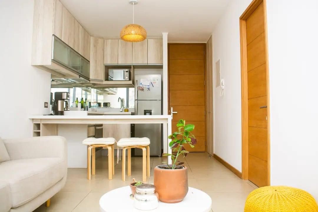 Beautiful 2D/2B butterfly-style apartment in Costa de Montemar, bright, quiet and located a 5-minute walk from the Concon dunes, ideal for resting and teleworking. New and smart apartment, boho style that features a large bedroom with a king size bed and a second room designed as a workspace. A large open kitchen with a vintage refrigerator, a terrace with ocean views, and parking.