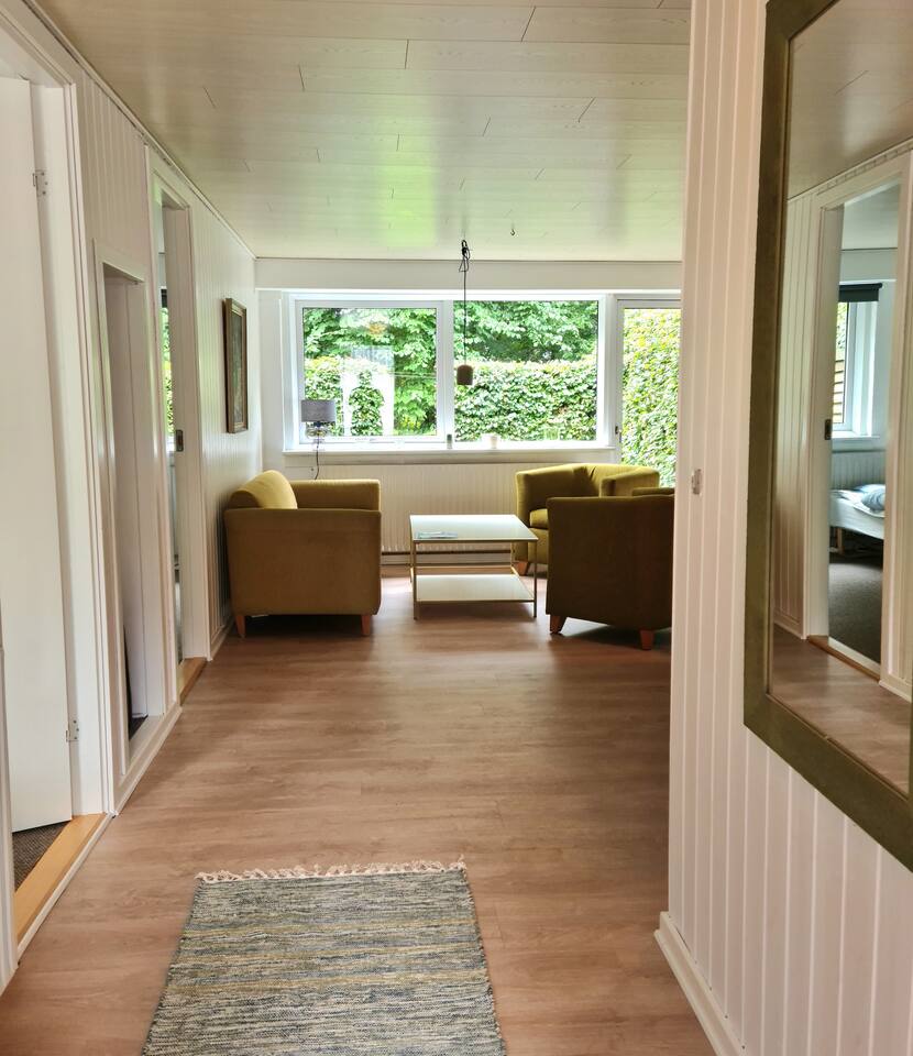 65 sqm. newly renovated high basement apartment with private entrance. The apartment is furnished with underfloor heating everywhere as well as a brand new toilet and kitchen in a nice bright style. The apartment has 2 rooms with double beds, and a double fold-out bed in the kitchen/living room. Outside, there is an 80 sqm tiled terrace in cozy surroundings that can be used for a barbecue evening or for relaxing during the day. There is a view of the garden and meadow, so relax with the whole family in this peaceful home.