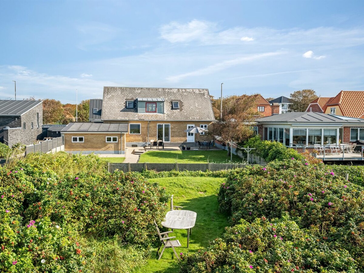 LUXURIOUS holiday home for 8, by meadow & beach close to Esbjerg, perfect holiday/work stay. Entrance with wardrobe, nice large kitchen & living room, as well as office space with 2 screens & lift-lower table, TV. Panoramic windows & access to fantastic garden & beautiful terraces. Large bedroom with elevation double bed, bunk bed, junior bed & exit. 2 rooms (2x2 elevation beds) Google TV & closet. 1 nice large bathroom with large shower, cabinets, washer, dryer. Carport & parking space.
