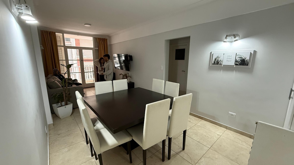 Departamento amplio de 4 ambientes para familias de hasta 6 personas, ubicado en zona comercial San Juan y a 5 cuadras de la terminal. Dispone de 2 habitaciones (cama queen y 2 individuales), living con diván cama, baño completo, patio privado y cocina totalmente equipada. Wi-Fi, Smart TV en living y dormitorios, aire acondicionado, calefacción y lavarropas. Check-in autónomo con clave. Cómodo, funcional y bien ubicado.