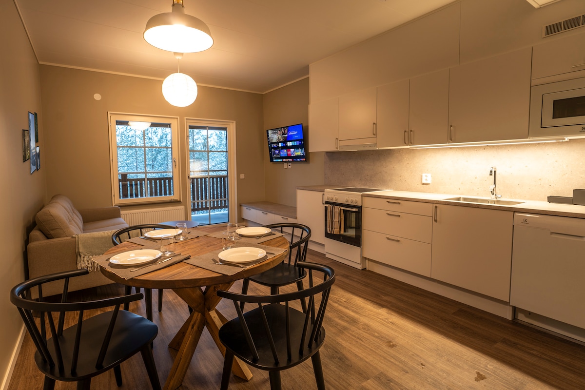 Relax with the whole family in this peaceful home. Our newly-built apartment is located at the very top of the Eagle's Village area, high up on Branäsberget. The property has large social areas and fantastic panoramic windows overlooking the Värmland forests. Here you will find all the facilities you could wish for; washing machine, drying cabinet, dishwasher, sauna, stove, Wi-Fi, TV and charging station for electric car. As a guest, you need to bring your own bed linens, towels and toilet paper. Cleaning is not included but can be booked.