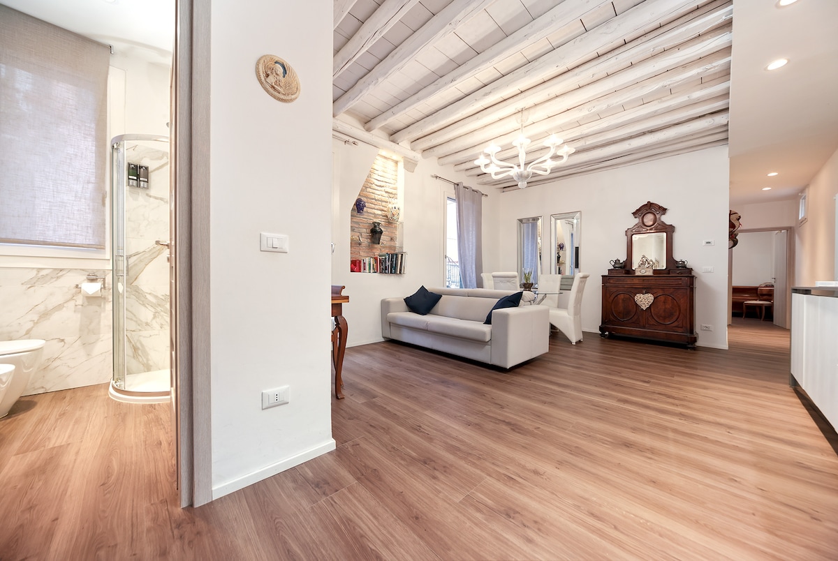 Apartment in the most green, true and luminous area of Venice, whose refurbishment was completed in August 2017, respecting the Venetian historical tradition and combining luxury and design of the years 70/80 (Cassina, Flos, Vasco, Artemide, Foscarini, Castiglioni and Carlo Scarpa) and without neglecting all the most modern comforts. On the third floor of a historical building in Campo Ruga (Castello), close to Basilica of San Pietro in Castello and 12 minutes by feet from Piazza San Marco.