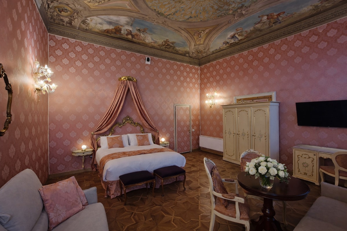 Inside a historic building, with frescoes, ceilings with beams and wooden floors, it stands out because of its large size and location, behind the Plaza delle Erbe, the square of the old Roman market. This suite has a private shower room. It has a view on the inner courtyard and not on the main square. Holiday rental authorization: 023091-LOC-01143