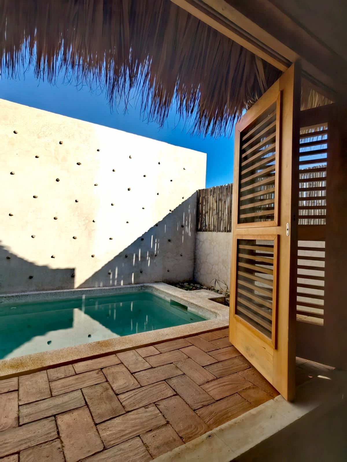 Located in Punta Zicatela, just a few minutes' walk from the beach, restaurants, and other attractions. With excellent internet both optic fibre and Starlink. Queen-size bed, AC, ventilator, kitchenette with fridge, coffee maker and water filter. A full bathroom, and a small closet. It features a balcony with a small table and two chairs, and wooden blinds with a view to the garden. Additionally, it has a private terrace on the second level, with a beautiful view, a small table and chairs.