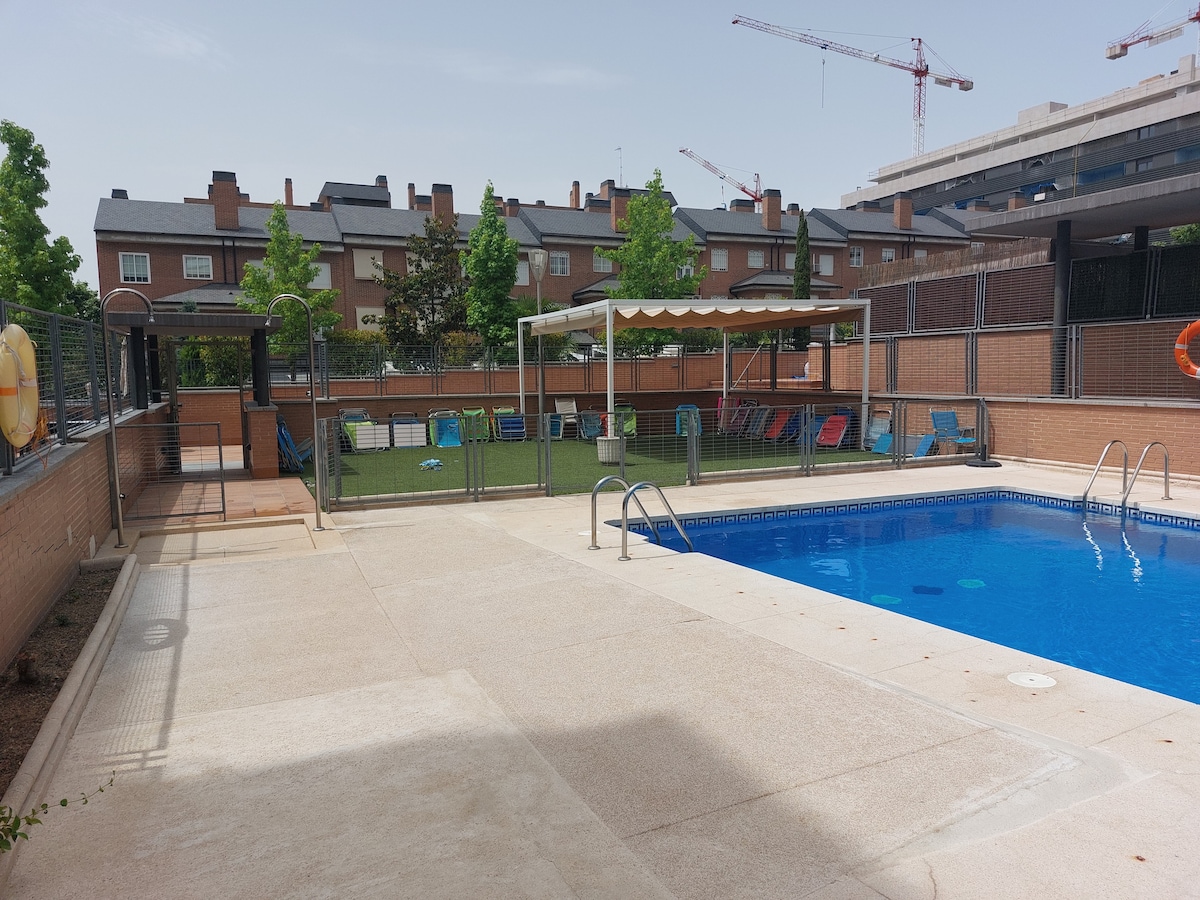 Temporary rental for work, medical or study stays. NON-TOURISTIC. Bright, comfortable, and fully equipped, with silent air conditioning, reinforced door and 24 hour surveillance. Pool (summer), gym, tennis, paddle and basketball court, and a wonderful garden. Located in one of the safest neighborhoods in Madrid. Juan Pablo II Park a few meters away. Very close to IFEMA, the Palacio de Congresos, Clínica Universidad de Navarra, and the airport, with excellent connections to the rest of Madrid