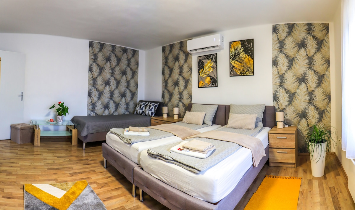 Veszprém kertvárosában, a központtól 8 perc autóútra, új építésű apartmanházban kínáljuk stílusos apartmanjainkat. Ingyenes parkolás az udvaron. Ebben az apartmanban infra szauna is várja a vendégeket. A hálóban egy nagy franciaágy, a nappaliban kihúzható kanapéágy van. 2 felnőtt +2 gyerek számára ideális. Az udvaron fűtött jacuzzi található, melyet mindhárom apartmanunk vendégei korlátlanul használhatnak.