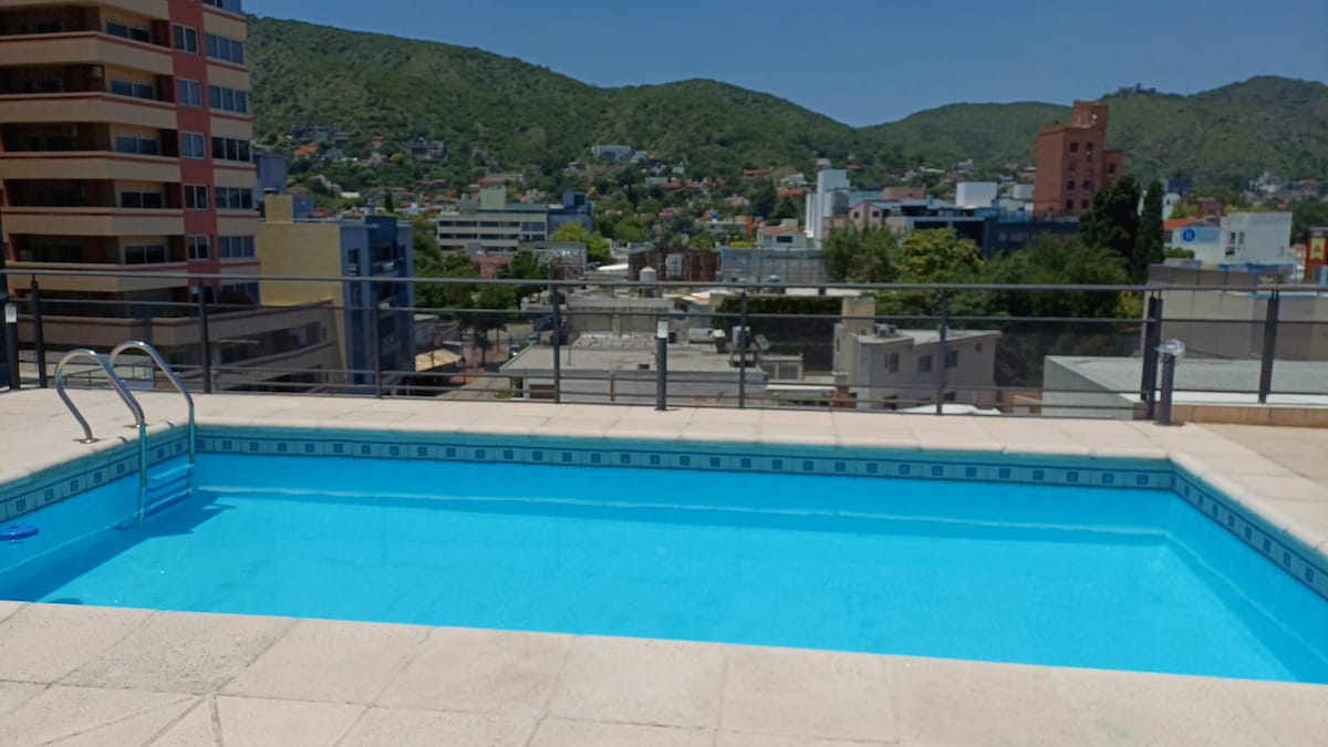 Depto con pileta y cochera privada cubierta. A 1 cuadra de la peatonal, dos cuadras Teatros, 1 cuadra de bancos y 3 cuadras del super Disco y 3 cuadras del mall WO. Dormitorio con cama de 2 plazas y aire acond. TV con Netflix y placard. Living comedor con aire acond., sillón cama para 1 adulto y 1 niño o bien, 2 niños por ser cama marinera. TV con Netlix y calefacción. Cocina equipada, baño completo y balcón con vista a las sierras. A metros de restos, galerias, farmacia, cafés y teatros!