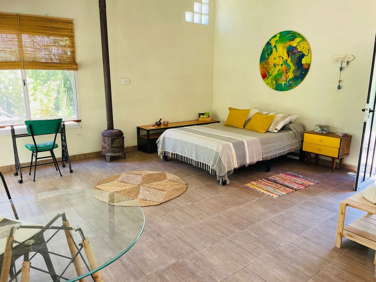 It's a studio apartment facing the river, in a thousand-meter park. Ten minutes from Capilla. Very easy access to the river and buses. It's not shared, but we live nearby for whatever you need. It has a well-equipped kitchen, A/C, Wi-Fi, Android TV, refrigerator, kitchen with oven, gas stove, fan, spar, water heater, sheets and towels; outside there is a barbecue, armchair, chairs and table, Paraguayan hammocks and covered garage. Optional: laundry, massages, and therapies. Ideal for 2 people, max 3 (couple with child).