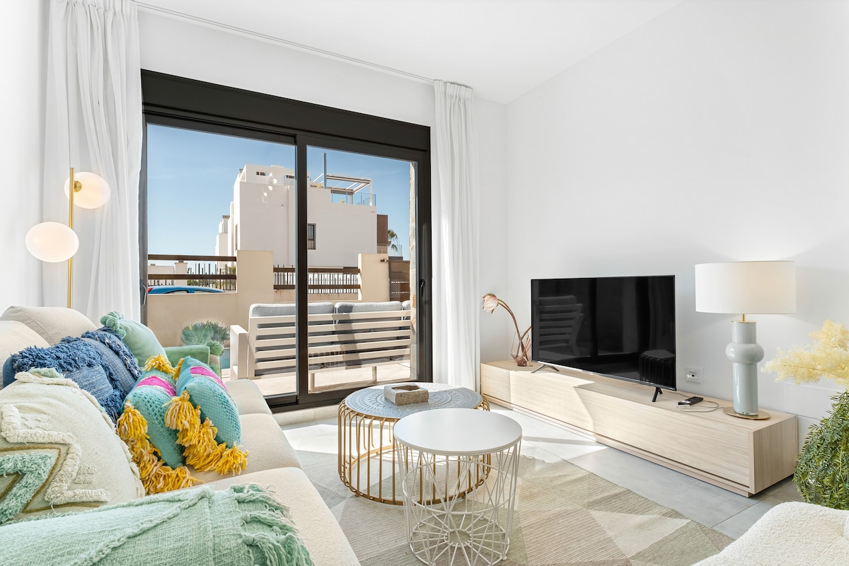Welcome to our modern apartment in Orihuela Costa, where comfort and style come together. Enjoy the tranquility and convenience of this location, complete with a luxurious lounge set and sun loungers for ultimate relaxation. Perfect for an unforgettable vacation. Each bedroom is equipped with a luxury extra television, allowing you to enjoy your favorite series and movies in peace. Outside, the beautiful luxury swimming pool invites you for a refreshing dip or a moment of relaxation under the sun.