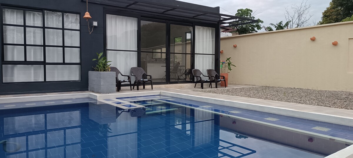 Relax with the whole family at this peaceful place to stay. Beautiful private cabin, located 30 minutes from Villavicencio. Excellent for resting, relaxing and having fun, enjoying a barbecue, hiking, visiting the river. The Los Potrillos (Mustang) cabin consists of two rooms, each with a private bathroom, fully equipped kitchen, BBQ area, and private pool. Sleeps 8 guests. Social and pool area with a wall for total privacy.