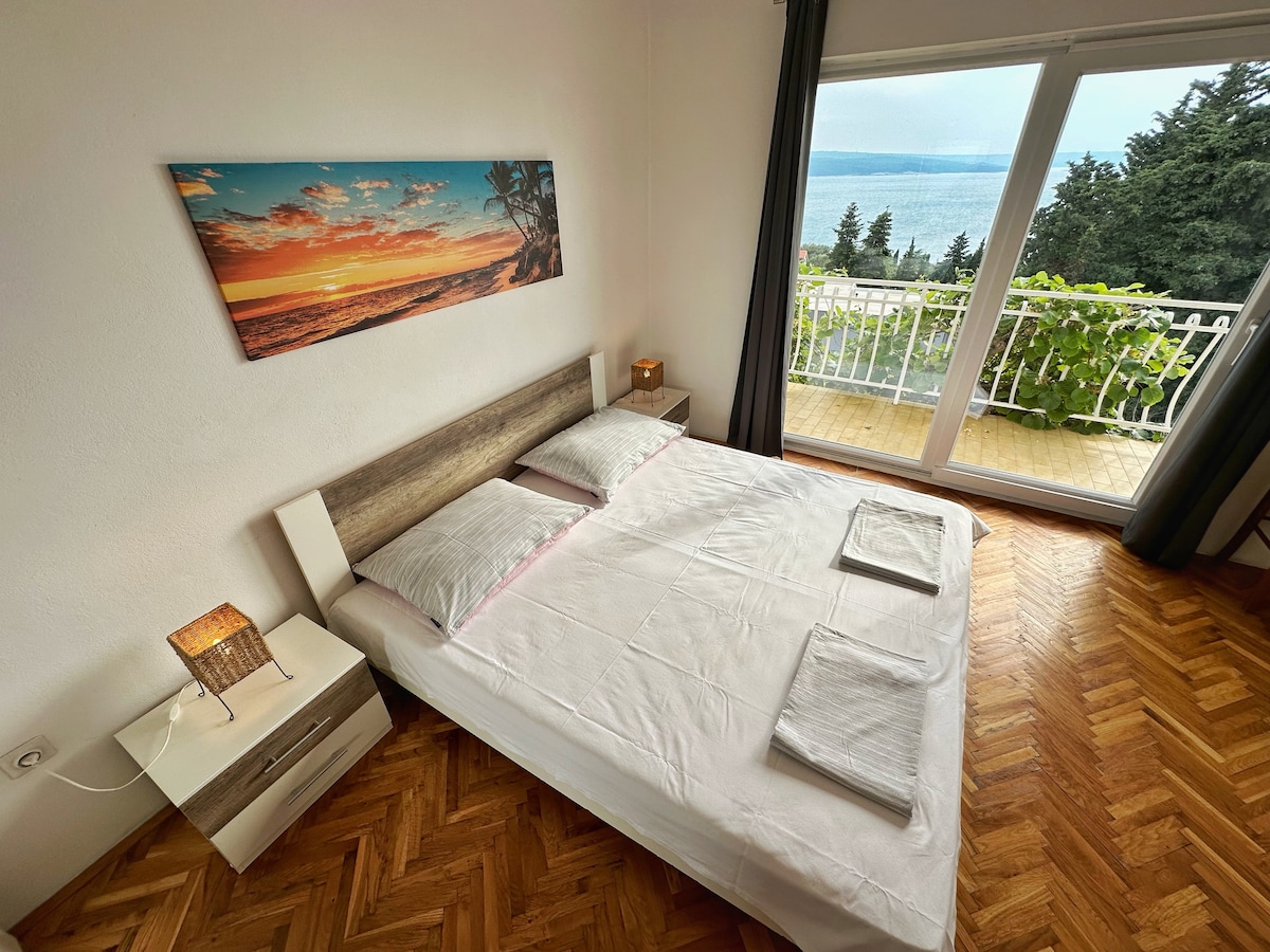 Apartment for max. 6 persons, situated on the 1st floor. Consists of a kitchen with dining area and living room (sleeping couch for two persons), bedroom (double bed), bedroom (2 x single bed), bathroom (shower + WC) and a balcony with sea view. Has SAT TV, WiFi, air condition and a parking place. It is located in Crikvenica, just 270 m from the sea and beach, 250 m from the nearest grocery store, 150 m from the restaurant and 1000 m from the city center.