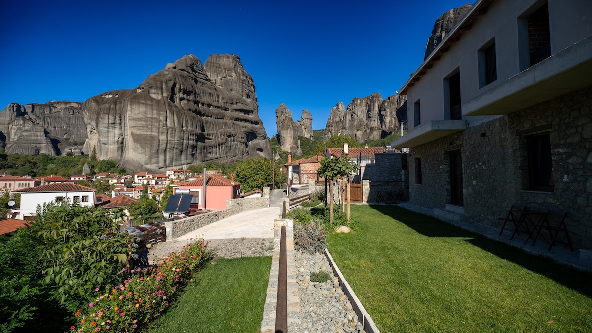 Modern, new studio lets you wake up under the rocks of Meteora.This fully equipped studio is perfect for travelers and couples seeking an unforgettable getaway.Start your morning with a traditional Greek coffee in our yard.Enjoy the tranquility and the sounds of our own private retreat, with the adventure of Meteora at your doorstep!