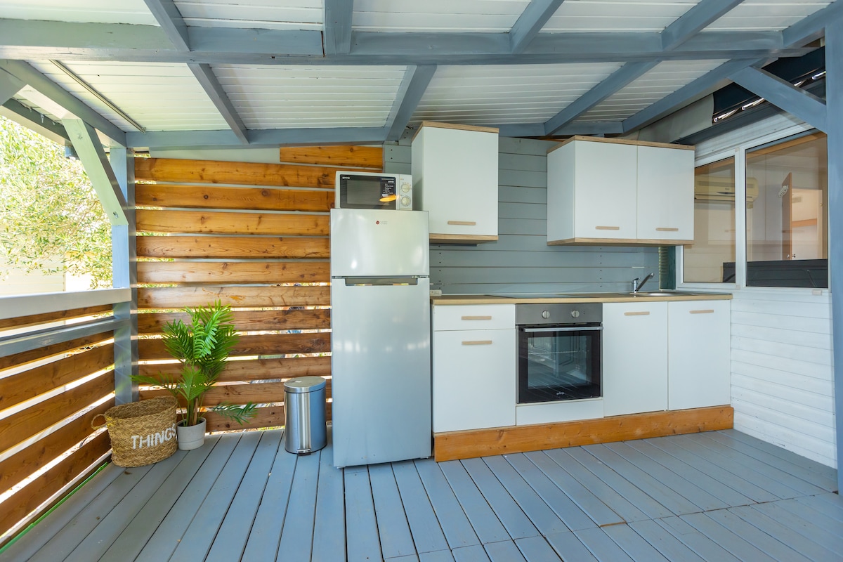 Newly bult complex of 5 mobile homes Shelbox (24 m2 each) with terrace space in front of mobile home with table and chairs. Price includes usage of swimming pool with pool chairs, air condition, bedctlothes and towels, usage of surface covered with artificial grass for relaxation and place for children to play. Sojurn tax is included in price. Homemade welcome drink is also included.