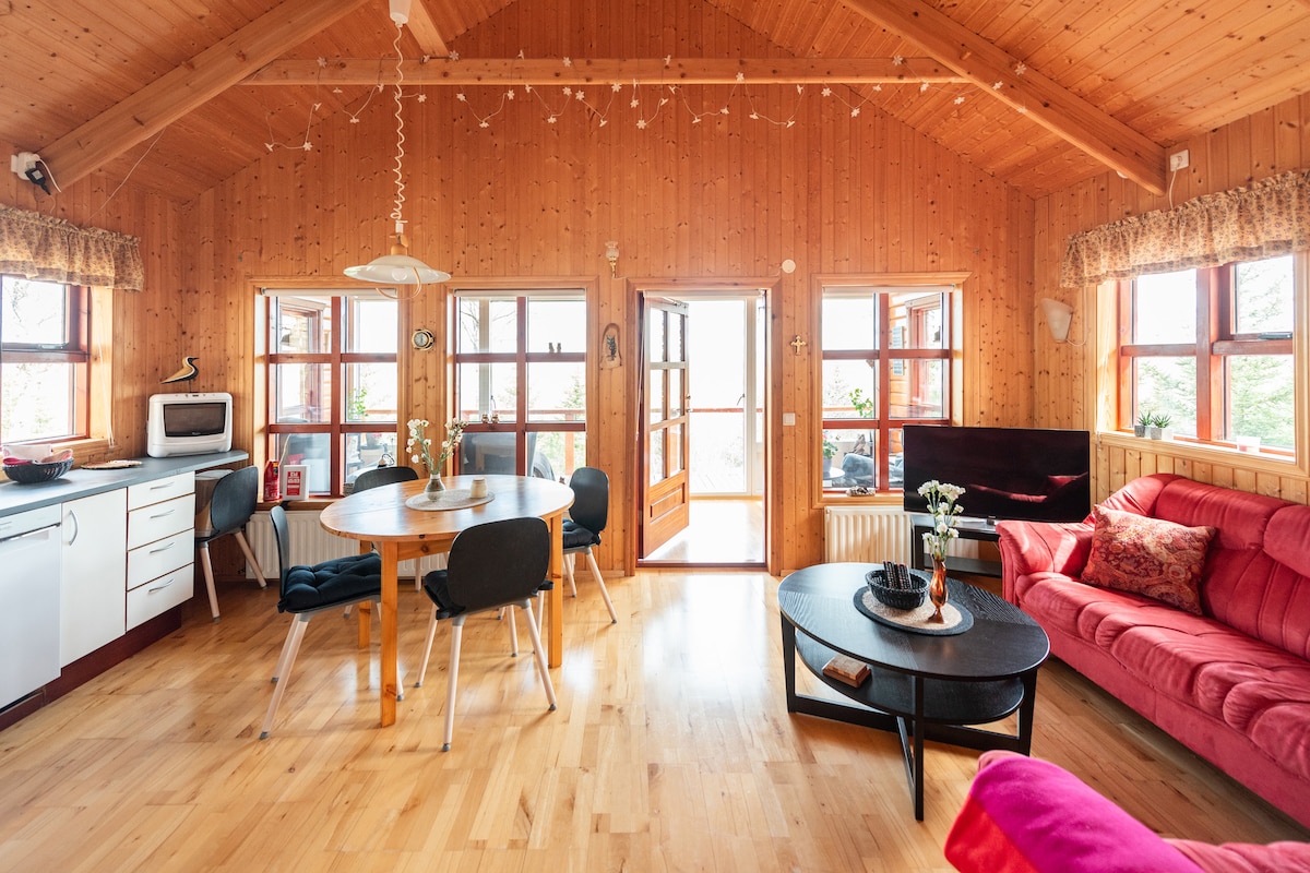 This getaway is very unique and secluded. It has spectacular panorama mountain view over two of Iceland's most famous volcanos and fantastic northern lights sightings. The house is cozy with lots of windows for enjoying the view. Sleeping space for 4 people, a comfortable full size bed and a luxury sofa bed. This place has a lot of character and Icelandic artwork on the walls also powerful wi-fi and a smart tv. Private washing room with washer and dryer.