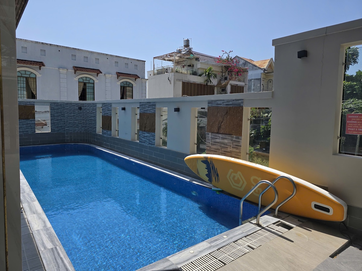 You can go anywhere nearby when your family stays at this centrally located place. Mai House Newly opened 1/2025 Beautiful modern design, relatively full of functions ✅5 bedrooms - 7 beds + (4 extra mattresses)- 6wc ✅ 3-storey street house with 1 ground floor, capacity 15 - 25k ✅Go to the beach, Xóm Luới market 900m (5 minutes by car) ✅ There is an indoor swimming pool of 30m2, with elevator ✅Bbq kitchen and basic kitchen facilities, washing machine... ✅ There is a parking space near the home Address : E6 Thai Van Lung Street, Ward 2, Vung Tau City.